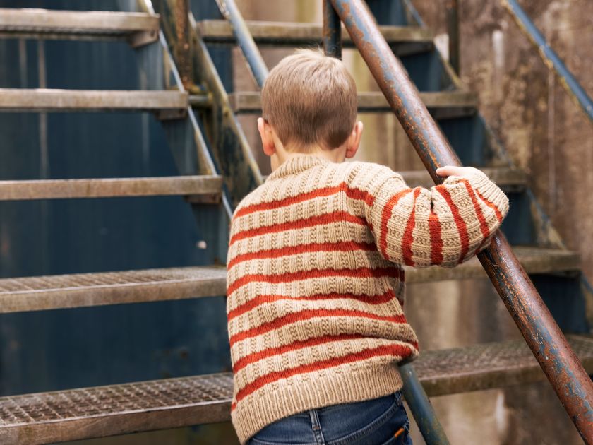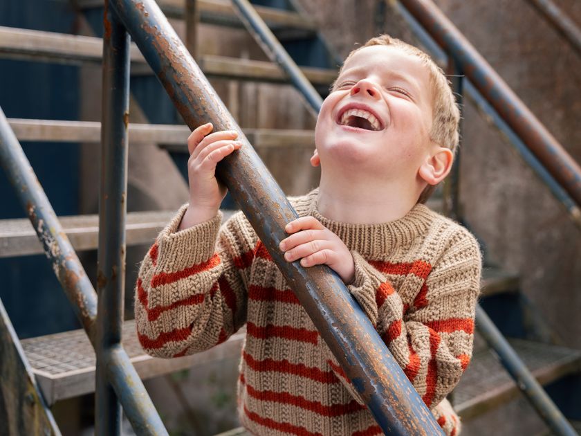 This sweater is inspired by a fishing trip on the pier in the sunset glow, a trip that the designer's son loves to go on with his grandfather. The sweater is warm and comfy, and great to wear when the wind bites. Knitted in Peruvian, it is perfect for play, outdoor life, and children's life in general. The fine textured pattern with stripes can be knitted in a multitude of colour combinations and is equally nice for girls as for boys.