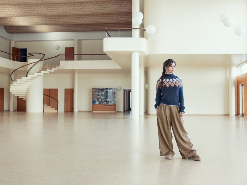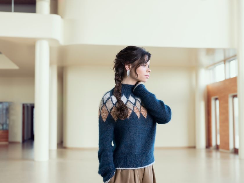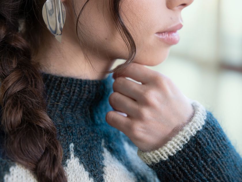 The construction of this sweater features the leaves of the artichoke placed around the yoke like a decorative and beautiful piece of jewellery.