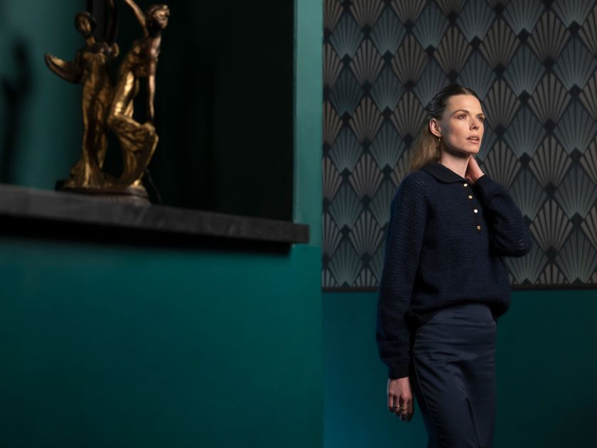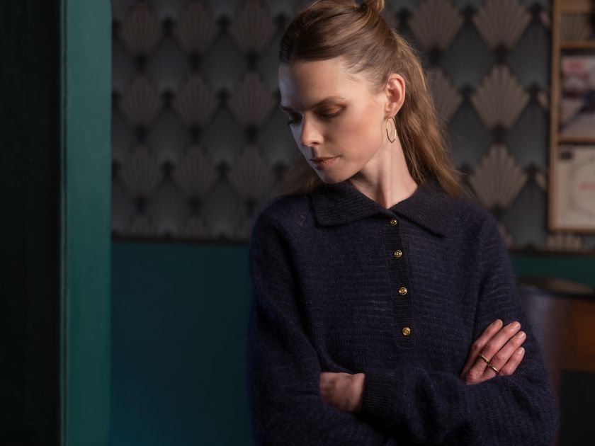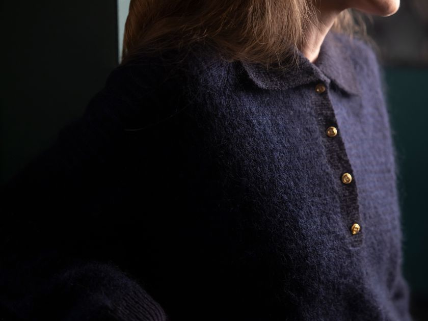 The designer stumbled upon a photo of Miles Davis from 1969, where he is leaning against a red sports car, while wearing suede trousers and an open, dark blue shirt with a classic collar. It is the extravagance, the swaying trouser legs, and the heavy gold chains that have inspired this polo blouse, Miles, with its transparent mohair stripes, the knitted rib collar, and the small gold buttons. Miles is knitted in Saga and Tilia, in colours that are closely related.