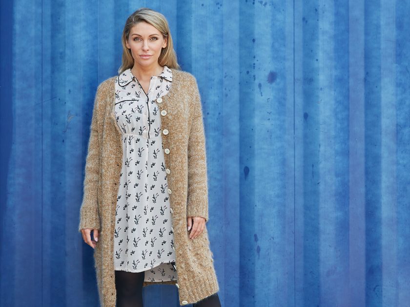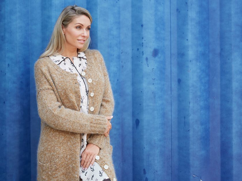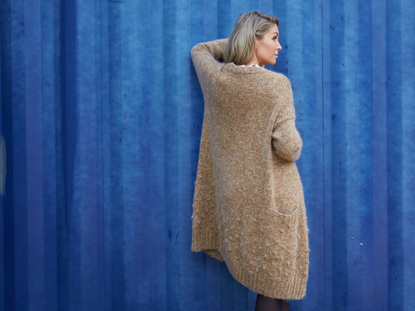 A gorgeously long and soft cardigan with big pockets and a lovely fit. Towards the hem is an delightful texture pattern with bobbles, that is fun to knit.